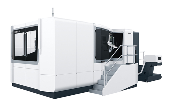 NHX10000は、DCG(重心駆動)とDDM(ダイレクト・ドライブ方式モータ)という2つのDMG MORIの独自技術に加え、安定性に優れたBox in Box構造を採用し、航空機や建設機械で需要の高いチタンやインコネルなど、難削材の大物加工の高速化、高精度化を実現させました。機内外の接近性を高めるステップの設置、スライド・旋回式操作盤の採用など、作業性が良いのも特長です。
